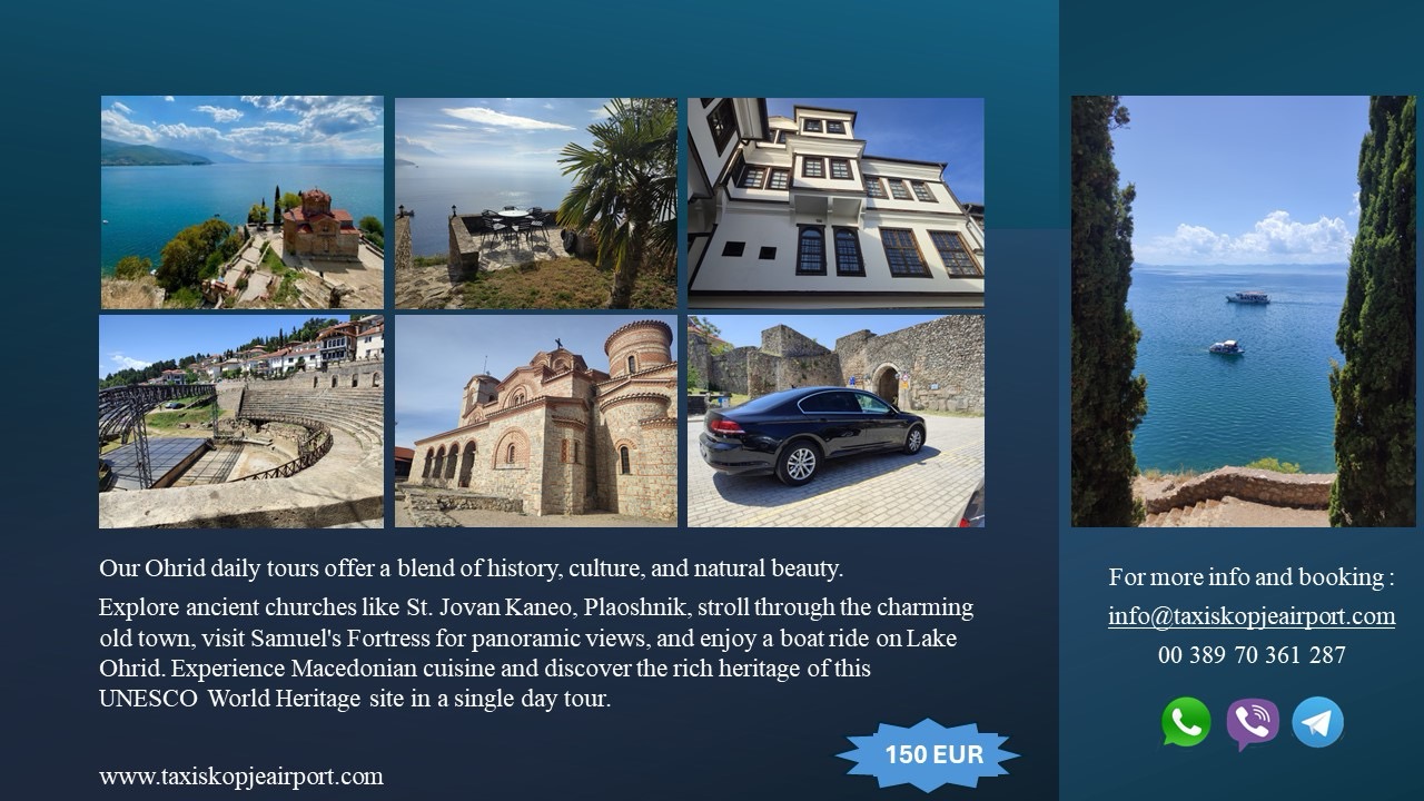 Payment in cash or an invoice, A fixed price, No unpredictable fare, No hidden charges, 24/7-Availability, Telephone +38970361287 Call/Viber/Sms